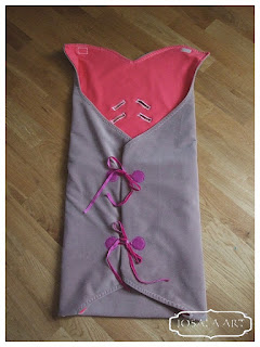 Śpiworek powstał dla małej Jadzi. Jej mama wymarzyła sobie taki właśnie otulaczek, w który mogłaby zawinąć swoją córę w lżejszym ubranku i spokojnie wyjść z nią na dwór. Śpiworek ma wycięcia na pasy i bez problemu mieści się w najmniejszym foteliku samochodowym. Posiada dodatkowe okrycie dla nóżek oraz rozpinany kapturek. Sam otulaczek zawiązywany jest dzięki aksamitnym wstążeczkom. Jest na prawdę ciepły. Oprócz wierzchnich warstw, w środku posiada jeszcze jedną bawełnianą warstwę. Miękki bladoróżowy welur oraz malinowa grubsza dzianina cudownie ze sobą współgrają. Maleńka na razie jeszcze siedzi sobie grzecznie pod sercem mamy, ale jak już się pojawi na świecie to na pewno będzie jej cieplutko i milutko w takim beciku. :)